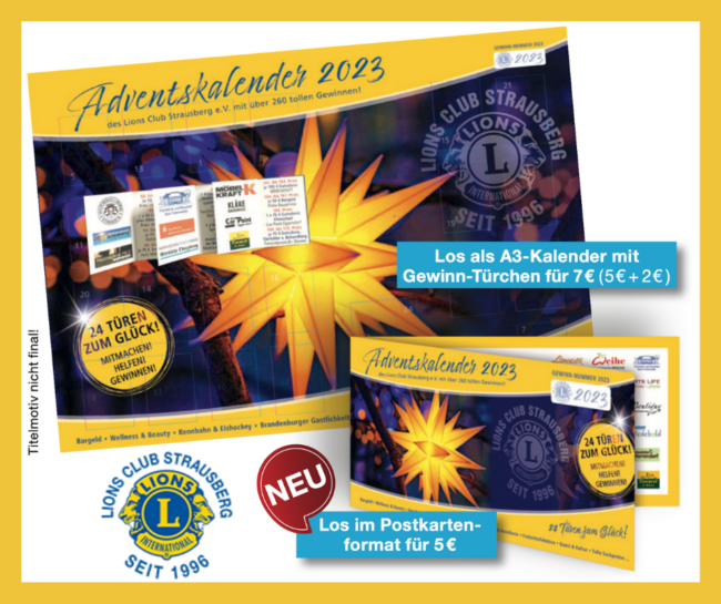 Es ist soweit – Die Gewinnzahlen des „Adventskalenders 2023“ wurden am 23. November 2023 ausgelost! Liebe Freunde des Lions Club Strausberg, Die Vorfreude auf die festliche Weihnachtszeit steigt und wir können es kaum erwarten, die Gewinner unserer über 260 liebevoll gestalteten Preise im Gesamtwert von mehr als 26.800 Euro bekannt zu geben! Ab 01.12.2023…